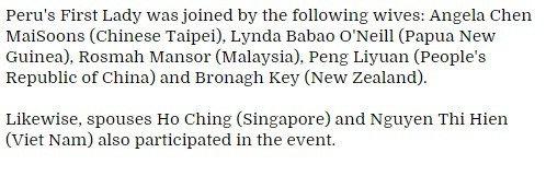 秘魯第一夫人邀請各經濟體領袖女眷出席活動,在照片圖說當中,將宋鎮邁錯誤寫為是宋楚瑜的妻子。