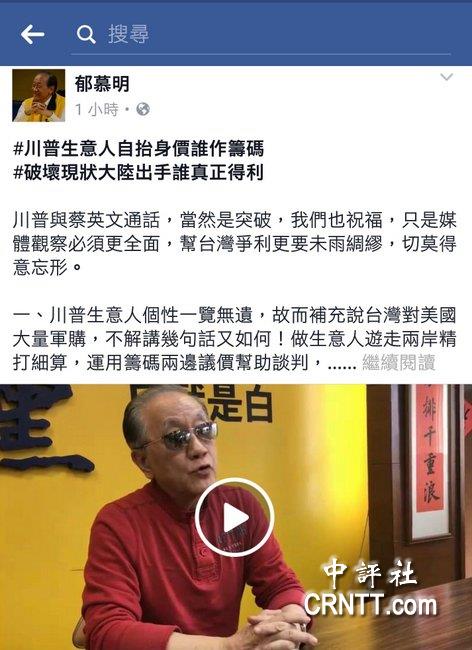 新黨主席郁慕明在“臉書”上發表對蔡英文與特朗普通話的看法(圖片來源:中評社)