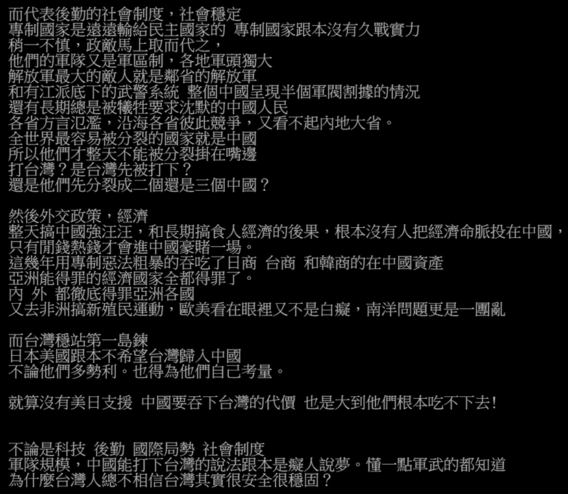 隨后文章從社會制度、外交、經濟等方面列舉了了自己的觀點,稱“全世界最容易被分裂的國家就是中國,所以他們才整天把不能被分裂掛在嘴邊,打臺灣?是臺灣先被打下?還是他們先分成兩個或三個中國?”“根本沒有人把經濟命脈投在中國,只有閑錢熱錢才會進中國豪賭一場。”“亞洲能得罪的經濟國家全都得罪了”。