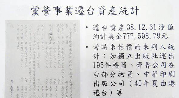 報告書也提到,據(jù)1949年12月31日統(tǒng)計,黨營事業(yè)遷臺資產(chǎn)約計77萬7598.79美元,換算新臺約8.85億元。另有未估價而未列入統(tǒng)計的設(shè)備,如獨立出版社運出195件機器、六魯公司在臺部分物資、中華印刷出版公司等。(中國臺灣網(wǎng) 王思羽)