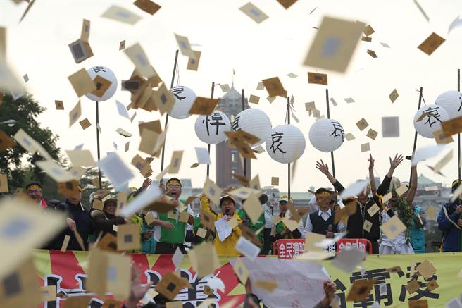 臺灣“軍公教勞”團體舉著白燈籠撒紙錢,為蔡英文當局“送終”。(圖片來源:臺灣《聯合報》)