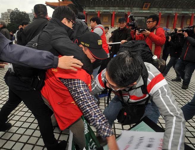 據(jù)了解,“急獨(dú)”的蔡丁貴昨率百位民眾到中正紀(jì)念堂,要拉倒中正紀(jì)念堂內(nèi)的蔣介石銅像。但因臺(tái)警方阻止不成,最后只好在中正紀(jì)念堂前的拱門(mén)下燒“青天白日旗”,向大門(mén)丟雞蛋。