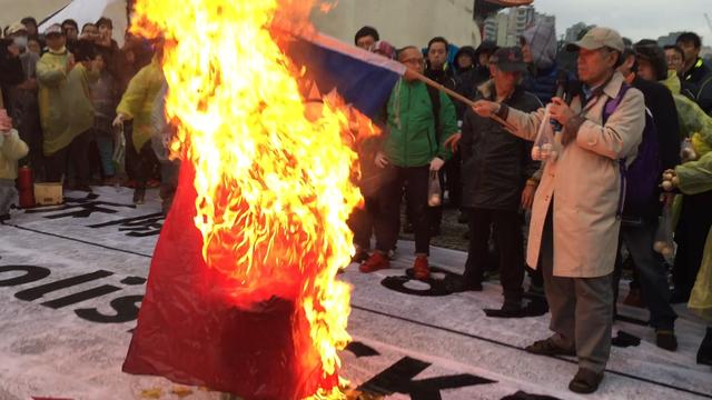 蔡丁貴“228”率眾大鬧中正紀念堂,燒旗并責罵蔡英文,被移送法辦。(臺媒圖)