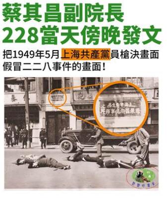 文傳會文傳會副主委毛嘉慶表示,在被爆圖片有誤后,蔡其昌也馬上下架、刪文,但隨后又換上一張發(fā)生在228的照片,內(nèi)容為暴民闖入專賣局臺北分局打死2人、毆傷4人的照片。