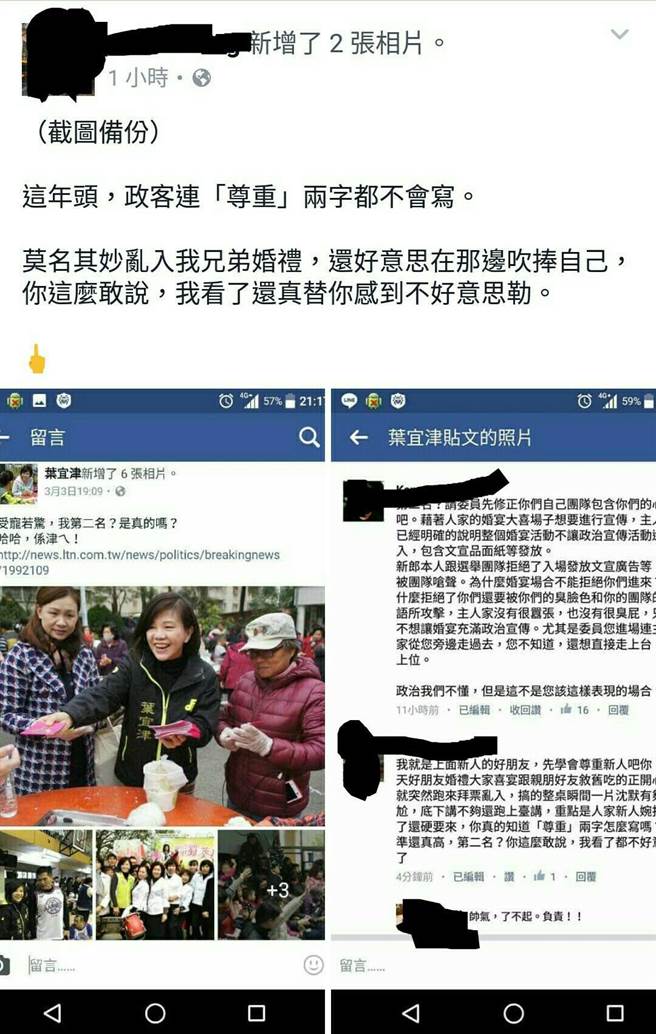 該網(wǎng)友在葉的貼文下留言痛斥:“第二名?請(qǐng)‘委員’先修正你們自己團(tuán)隊(duì)包含你們的心態(tài)吧。借著人家的婚宴大喜場(chǎng)子想進(jìn)行宣傳,主人家已經(jīng)明確說(shuō)明整個(gè)婚宴活動(dòng)不準(zhǔn)政治宣傳活動(dòng)進(jìn)入,包含文宣品面紙等發(fā)放。新郎本人拒絕選舉團(tuán)隊(duì)入場(chǎng)發(fā)放文宣廣告等,竟還被團(tuán)隊(duì)嗆聲。為什么婚宴場(chǎng)合不能拒絕你們進(jìn)來(lái)?為什么拒絕了你們,還要被你們的臭臉和你的團(tuán)隊(duì)言語(yǔ)攻擊?尤其是‘委員’您進(jìn)場(chǎng)后,連主人家從您旁邊走過(guò)去,您都不知道。還想直接走上臺(tái),坐上位。政治我們不懂,但是這不是您該這樣表現(xiàn)的場(chǎng)合!