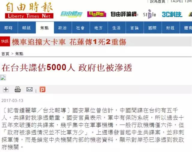 臺灣《自由時報》:“在臺共諜估5000人 政府也被滲透”↓