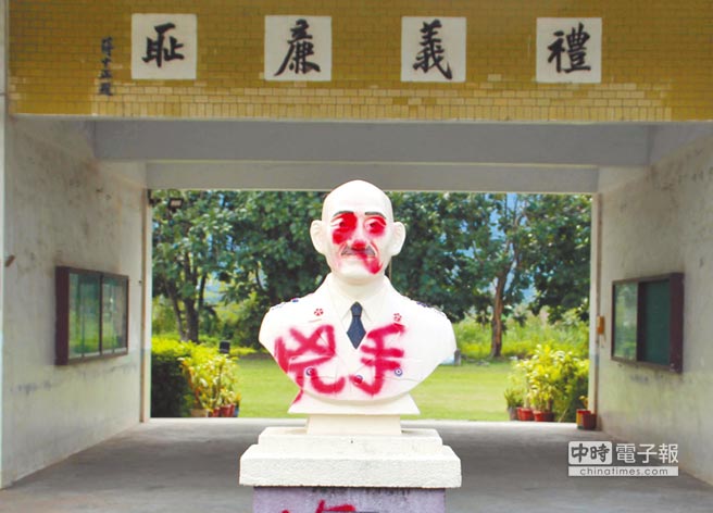 2017年3月1日,花蓮壽豐鄉吳全社區活動中心將蔣公銅像雙眼、嘴角皆噴上紅漆。(圖片來源:臺灣《中時電子報》)
