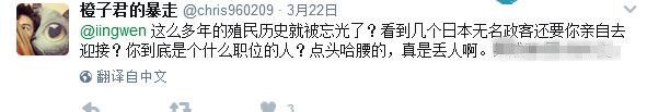 網友@橙子君的暴走也表示:這么多年的殖民歷史就被忘光了?看到幾個日本無名政客還要你親自去迎接?你到底是個什么職位的人?點頭哈腰的,真是丟人啊。