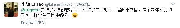 網友李陶 Li Tao?:典型的奴顏婢膝,為了討你的主子歡心,居然用鳥語,是不是你也要和登灰一樣說自己是倭奴啊。