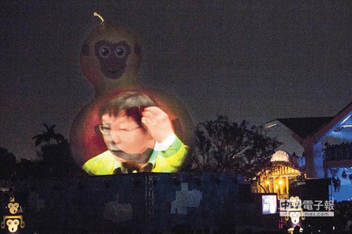 主辦單位把臺北市長柯文哲抓頭的經典圖像也投射在主燈上,形成另種趣味。(臺灣《中國時報》)