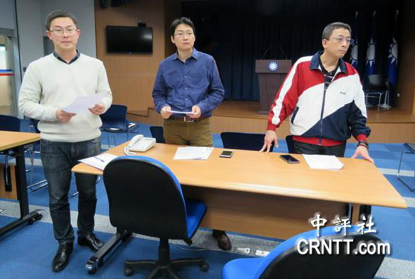 國民黨中央28日下午邀6位黨主席參選陣營開會協商選務,會后,國民黨文傳會副主委胡文琦(右起)、詹啟賢競選總干事林政緯、郝龍斌發言人金大鈞一起說明立場。(圖片來源:中評社)