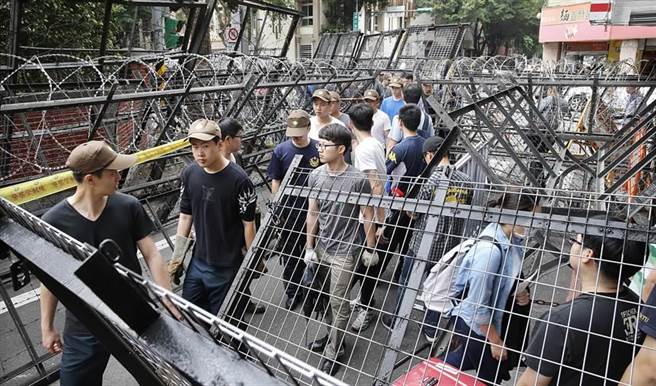 為因應(yīng)監(jiān)督年金改革行動(dòng)聯(lián)盟及“800壯士”的“夜宿圍城”行動(dòng),臺(tái)“立法院”周圍架起層層蛇籠拒馬,留下迷宮般的通道。(圖片來源:臺(tái)灣“中時(shí)電子報(bào)”)