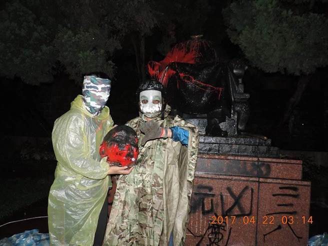 臺(tái)灣“獨(dú)派”團(tuán)體“臺(tái)灣獨(dú)立建國(guó)工程隊(duì)”“斬首”蔣介石銅像,兩名“臺(tái)獨(dú)”分子均戴面具。(圖片來(lái)源:臺(tái)“中時(shí)電子報(bào)”)