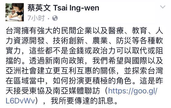 隨后,她通過社交媒體發文,稱“臺灣擁有的是強大的民間企業及醫療、教育、人力資源開發、技術創新、農業、防災等各種軟實力,這些都不是金錢或者政治力可以取代或阻擋的!币鹋_灣網友的質疑。