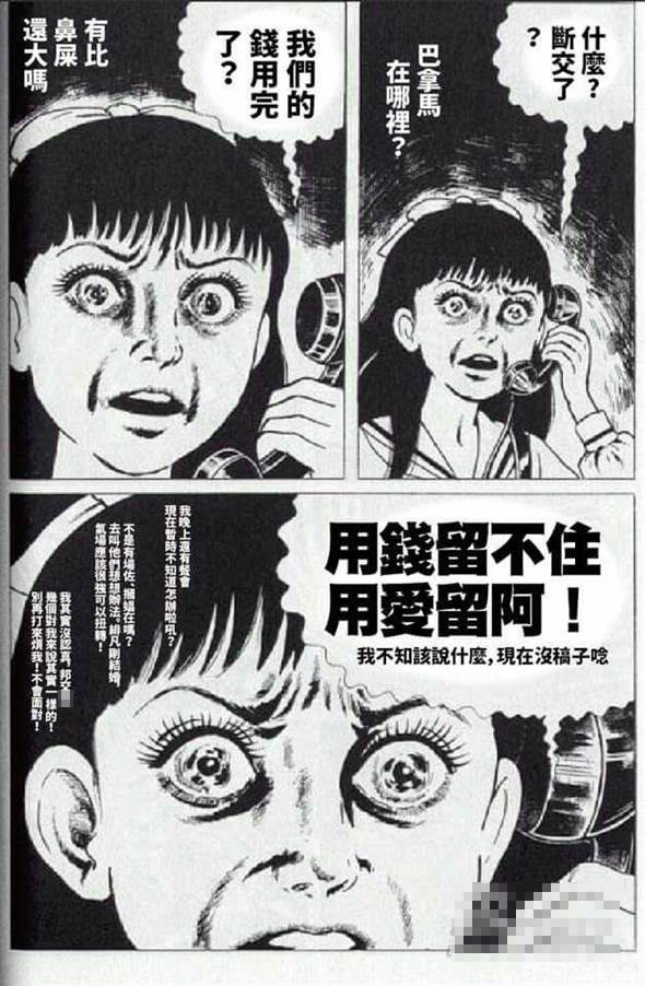 這則三格漫畫改編自日本漫畫家楳圖一雄的恐怖漫畫《漂流教室》,畫中女主角拿著電話筒,表情驚恐地說:“什么?‘斷交’了?”、“我們的錢用完了?”、“用錢留不住,用愛流啊。ㄎ也恢撜f什么,現在沒稿子念)”。
