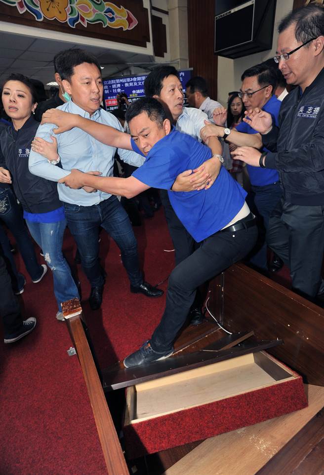 藍、綠“立委”們爆發(fā)推擠沖突,發(fā)言臺也在雙方拉扯中應聲倒地,現(xiàn)場混亂。(圖片來源:臺灣“中時電子報”)