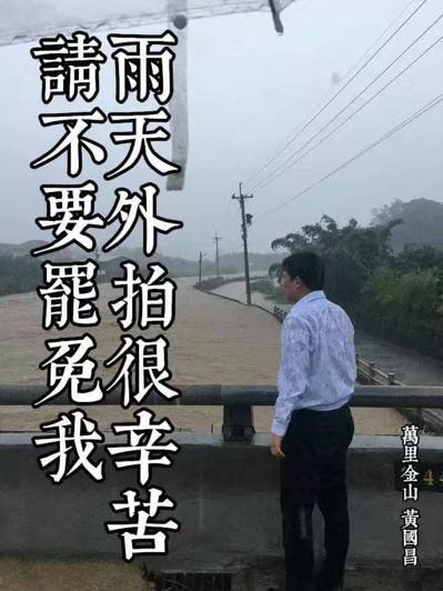 今年6月臺灣北部淹水,“時代力量立委”黃國昌回新北選區(qū)勘災。照片中,一旁的人撐著傘或穿雨衣,僅他一人濕身一片,但遭到大批網(wǎng)友諷刺上演“濕背秀”。網(wǎng)友惡搞改圖狠酸黃國昌是“立法院最佳演員”、“雨天外拍很辛苦,請不要罷免我”、“難道濕身比較帥?”、“時力買不起雨衣?”等。