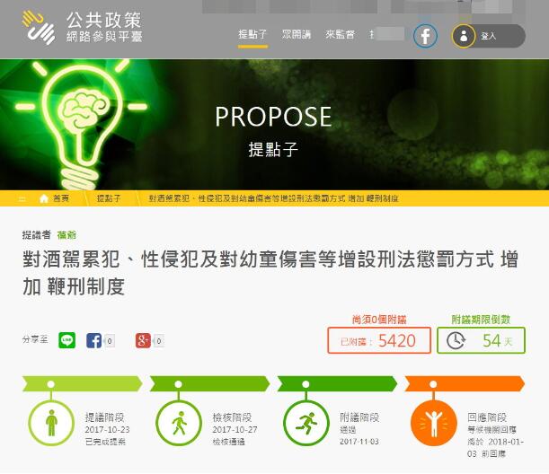 中國臺灣網(wǎng)11月3日訊 據(jù)臺灣《中時電子報》報道,近年來,臺灣的性侵事件防不勝防,有網(wǎng)友在上月23日針對性侵、酒駕及幼童傷害,擬增設(shè)“鞭刑制度”,并在“公共政策網(wǎng)絡(luò)參與平臺”提案,目前已有5000人附議通過,相關(guān)機構(gòu)須在明年1月3日前響應(yīng)。