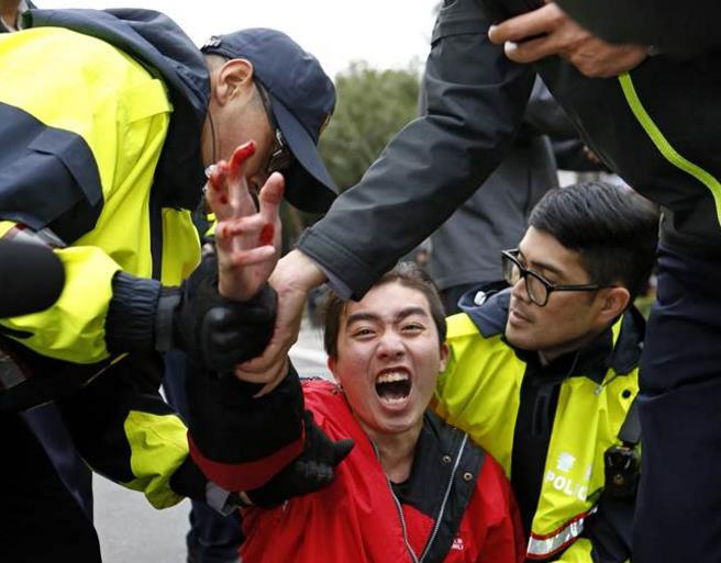 勞團(tuán)成員發(fā)動突襲,其中3人翻過“立法院”大門遭警方以優(yōu)勢人力制伏。(圖片來源:臺灣《中時電子報(bào)》)