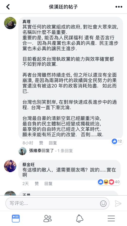 更多網友以文字表達對臺灣一邊標榜“自由”一邊被內耗拖垮現狀的憤怒: