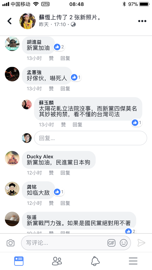 “你我都可能成為下一個王炳忠?”這同樣是在臺灣社交網絡上頻繁出現的問句。由于臺當局在王炳忠家只搜出幾份簡體字賬冊和數張人民幣現鈔,很多臺灣網友也開始以此為梗諷刺民進黨,此前表示希望加入中國共產黨的臺生王裕慶凌晨在朋友圈貼出一份學習十九大文件和一張1元人民幣鈔票:“估計明天臺灣檢調在我宿舍只會搜到這些‘罪證’,對不起,臺灣檢調,人民幣那么少,完全是‘共犯’馬云的原因,我招供,我是用了支付寶!”
