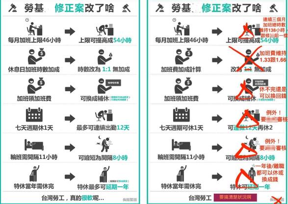 對此,林靜儀轉載了林長揚制作的圖表,并在該圖上一一指正,用紅筆打三角形、打叉叉,并在一旁解釋“真實的狀況”,包含加班總時數跟“修法”前一樣、加班費維持、輪班間隔需當局相關部門審核等。此外,該圖表尾端原本寫著的“臺灣勞工,真的很軟呢”也被林靜儀直接改成:“臺灣勞工,要搞清楚狀況啊!”