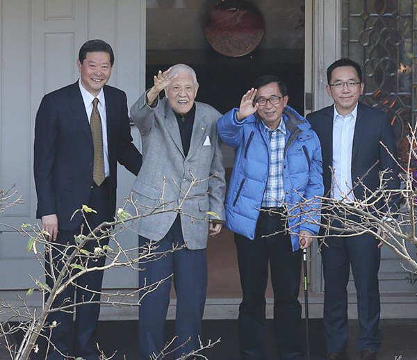 陳師孟認為若照正常法律來看,陳水扁不構(gòu)成貪污。圖為李登輝(左二)與陳水扁(右二)。(圖片來源:臺灣《中時電子報》)
