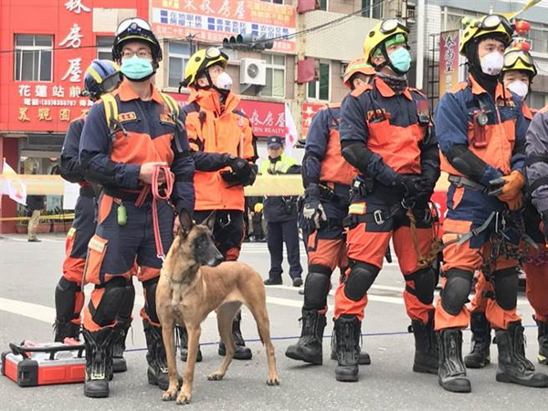 特搜人員與搜救犬進(jìn)駐翠堤大樓現(xiàn)場。(圖片來源:臺灣“中時電子報”)