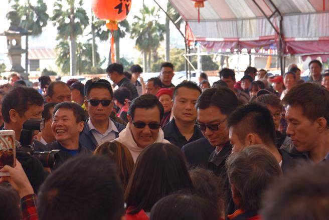 臺灣地區(qū)前領(lǐng)導(dǎo)人馬英九(白衣者)17日至新竹縣義民廟上香、贈春聯(lián),人氣不減。(圖片來源:臺灣“中時電子報”)