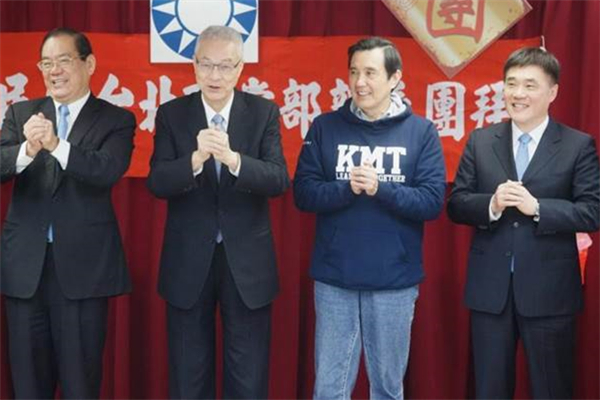 國民黨臺北市黨部22日舉辦新春團拜,國民黨副主席郝龍斌(右起)、前臺灣地區領導人馬英九、國民黨主席吳敦義、國民黨秘書長曾永權拱手做揖拜晚年。(圖片來源:臺灣《中時電子報》)