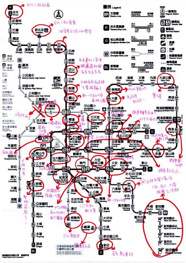 報道說,一名在臺北就讀大學3年的臺中網友,根據臺北捷運沿線整理各站著名景點。臺北車站是“迷宮,外地人出不去”、劍潭“士林夜市在這里,不要被騙了”、新北投“臺北人的澡堂”、淡水“臺北人的郊區”、龍山寺“可拜月老”、中正紀念堂“出錯出口得繞一大圈”、板橋“圣誕節超多人”等等。