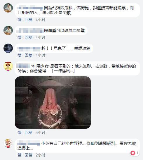 對于“神隱少女”蔡英文口中“你不知道我在接近你”的說法,網友貼出靈異少女的圖片大呼,“見鬼了,鬼話連篇”、 “神隱少女”是看不到的;她來無影、去無蹤,當她接近你的時候;你會覺得……“一陣陰風……”