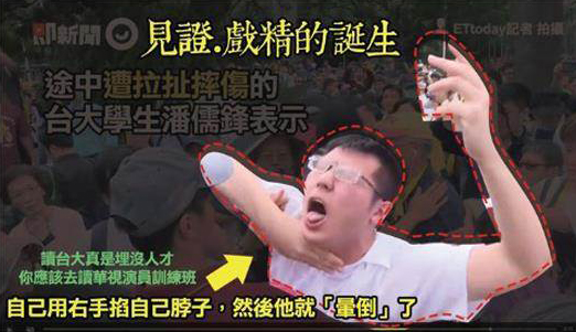 中國臺灣網5月5日訊 為反對蔡英文當局違法亂政,強行拔出“顏色不對”的管中閔當選校長資格,臺大自主聯盟4日發起“新五四運動”,校內“挺管”、“反管”的力量也爆發沖突。臺灣“中時電子報”報道,“反管”陣營的臺大資管系學生潘儒鋒聲稱,沖突中,他被人從后拉扯勒住以致摔倒。不過,隨后曝光的沖突影片卻顯示,其是自己用手掐脖子而后倒地,進而被網友群起遭諷。“你這么好騙,你家里人知道嗎?”Facebook粉絲頁發圖笑說:見證戲精誕生!自己用手掐脖子、自己倒地,謝謝潘同學為我們帶來這么有創意的表演,來賓請給分。
