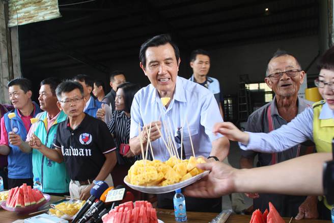 馬英九請在場人士品嘗菠蘿,化身為大樹區菠蘿最佳代言人。(圖片來源:臺灣“中時電子報”)