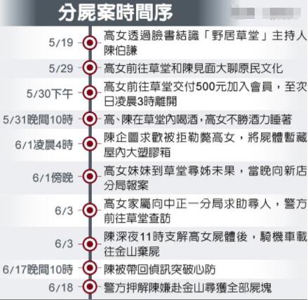 報道稱,5月29日,高女下班后到草堂找陳伯謙聊天,談得頗為投機的兩人還展開了徹夜長聊,隔天,高女再度前往草堂,交了500元新臺幣學費后便加入了會員,并留在草堂至次日凌晨3點才離開。