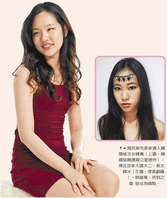 國民黨高雄市長參選人韓國瑜次女韓青(右圖),現在加拿大讀大二。長女韓冰(左圖),顏值高,所到之處皆成焦點。(圖片取自臺媒)