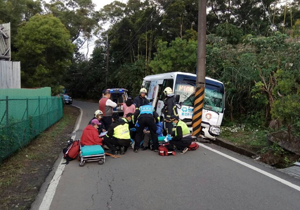 新北免費巴士自撞電線桿,車上都是年邁的阿公、阿嬤,救護車迅速趕抵協助送醫。(圖片來源:臺灣《聯合報》)