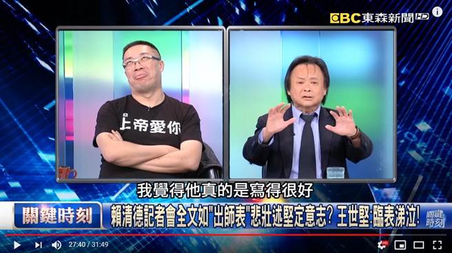 王世堅(jiān)在節(jié)目中表示,賴(lài)清德的記者會(huì)讓他相當(dāng)感動(dòng),有如《出師表》般優(yōu)秀,“出師表”三字一出,全場(chǎng)笑聲不斷,主持人更問(wèn)“你有臨表涕泣嗎?”王世堅(jiān)秒回“對(duì),我臨表涕泣,我覺(jué)得他真的是寫(xiě)得很好”,此時(shí)嘉賓朱學(xué)恒在一旁翻白眼吐舌忍笑,但最終還是忍不住笑了出來(lái)。