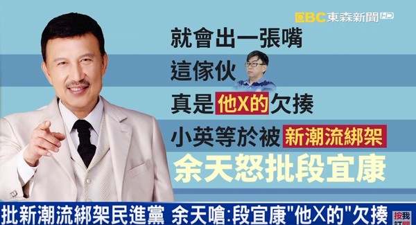 余天日前接受媒體采訪時嗆段宜康,“真他X欠揍”。(圖片來源:臺灣“東森新聞云”)