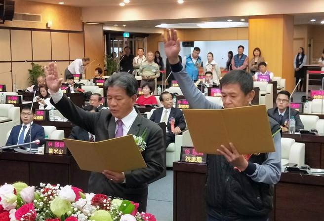郭信良(左)、無黨籍林炳利贏得臺(tái)南市正副議長選舉后隨即宣誓就職。(圖片來源:臺(tái)灣“中時(shí)電子報(bào)”)