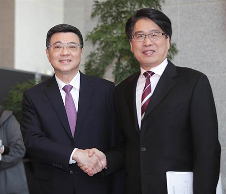 民進(jìn)黨第16屆黨主席補(bǔ)選電視政見發(fā)表會29日舉辦,前臺當(dāng)局“行政院秘書長”卓榮泰(左)與“臺灣民意調(diào)查基金會”董事長游盈隆(右)在入場前相互握手致意。(圖片來源:臺灣“中時(shí)電子報(bào)”)