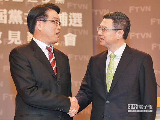 民進黨第16屆黨主席補選電視政見發(fā)表會4日舉行,前臺當局“行政院秘書長”卓榮泰(右)與“臺灣民意基金會”董事長游盈隆(左)會前相互握手致意。(圖片來源:臺灣“中時電子報”)