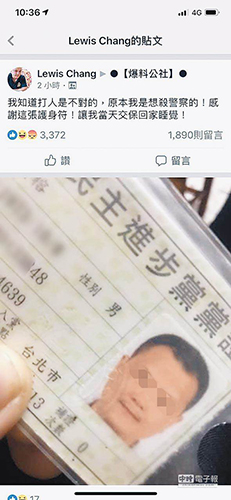 但張某卻于26日晚間在臉譜網(facebook)社團“爆料公社”發文,稱“我知道打人就是不對,我原本是想殺警察的,感謝這張護身符,讓我當天交保回家睡覺”,并附上他的民進黨證照片,公開向警方嗆聲。警方認為張某已另涉嫌“恐嚇公眾罪”,將傳喚張某到案后送辦。