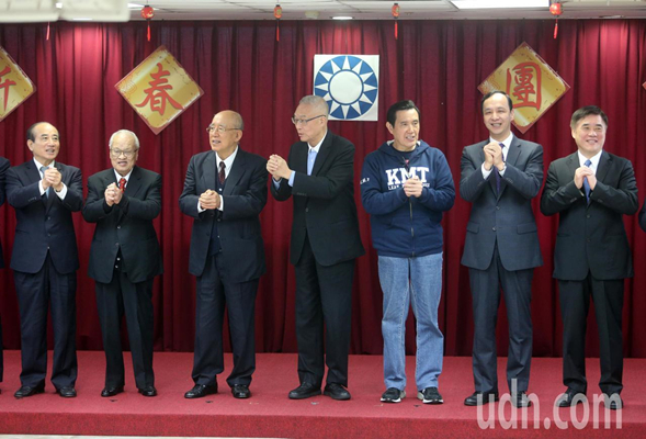國民黨11日舉行新春團拜,包括國民黨主席吳敦義(中)、前臺灣地區領導人馬英九(右三)、前新北市市長朱立倫(右二)、前國民黨主席吳伯雄(左三)、前臺“立法院長”王金平(左一)等一同出席,一起向黨內同志拜年。(圖片來源:臺灣《聯合報》)