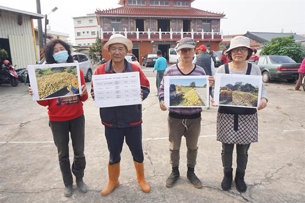 13日下午麻豆柚農郭新聰(左二)與其他柚農拿出去年照片,證明去年麻豆柚子確實因產量過剩賣不好,個別果農將自家賣不出去的柚子傾倒在自家果園土地旁。(圖片來源:臺灣“中時電子報”)
