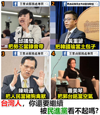 蔡當局執政后不僅推出的政策不得民心,許多官員的言論也經常引發爭議。對此,“鳳凰花護民主市政監督聯盟”PO文指出,綠營“立委”邱議瑩,把勞工當“錄音帶”;蔡英文辦公室發言人黃重諺,把高雄市長韓國瑜當“土包子”;臺陸委會主委陳明通把人民當“豬狗禽獸”;民進黨“立委”蕭美琴,把鴻海集團總裁郭臺銘當“空氣”。該粉專直言“臺灣人,你還要繼續被民進黨看不起嗎?”(中國臺灣網 劉洪羊)