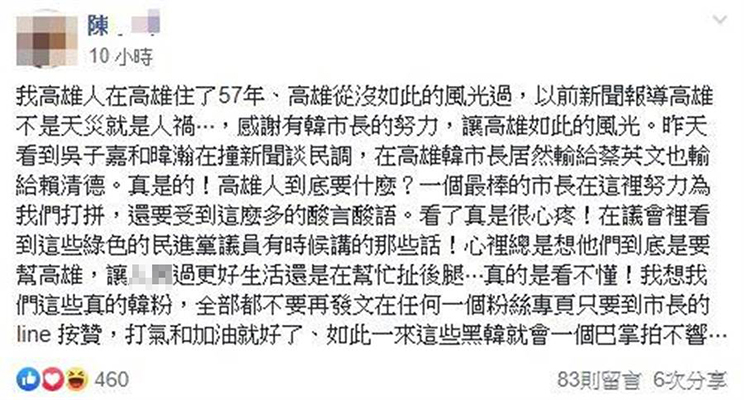 中國臺灣網5月7日訊 據臺灣“中時電子報”報道,臺灣“美麗島電子報”董事長吳子嘉昨日(6日)在廣播節目中提及最新民調,并稱高雄市長韓國瑜若參選2020,無論對上賴清德或蔡英文,在高雄市皆輸3%至4%。對此,有名網友表示,她在高雄住了57年,“高雄從沒如此的風光過!”并表示看到韓國瑜打拼還要受到這么多的酸言酸語,很心疼!