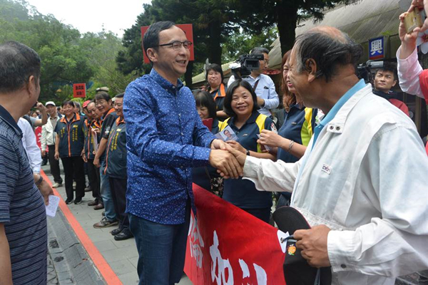 有意爭取2020提名的前新北市長朱立倫10日到苗栗參訪,與支持者握手寒暄。(圖片來源:臺(tái)灣“中時(shí)電子報(bào)”)
