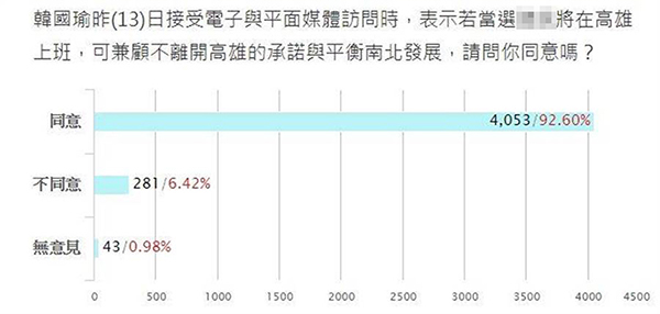 中國臺灣網(wǎng)5月15日訊 據(jù)臺灣“中時電子報”報道,高雄市長韓國瑜日前接受專訪時松口表示,愿接受國民黨征召、參選2020,更表示“選上就在高雄上班”。對此,臺灣“中時電子報”昨日(14日)推出網(wǎng)絡(luò)投票,廣邀網(wǎng)友參與投票表達(dá)看法。截至今天早上七點半,有高達(dá)92.6%網(wǎng)友同意韓國瑜當(dāng)選后在高雄上班,力挺韓國瑜。