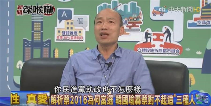韓國瑜受節目《新聞深喉嚨》專訪表示,三年前,投給蔡英文的只有三種人。第一,討厭國民黨:看到國民黨就投不下去!第二,希望臺灣“獨立”:支持你蔡英文,趕快“獨立建國”!第三,我希望過好日子:國民黨執政我沒有把握,民進黨可以給我帶來好生活!“這三種人把票投給蔡英文,我都幫蔡英文分析好了!”